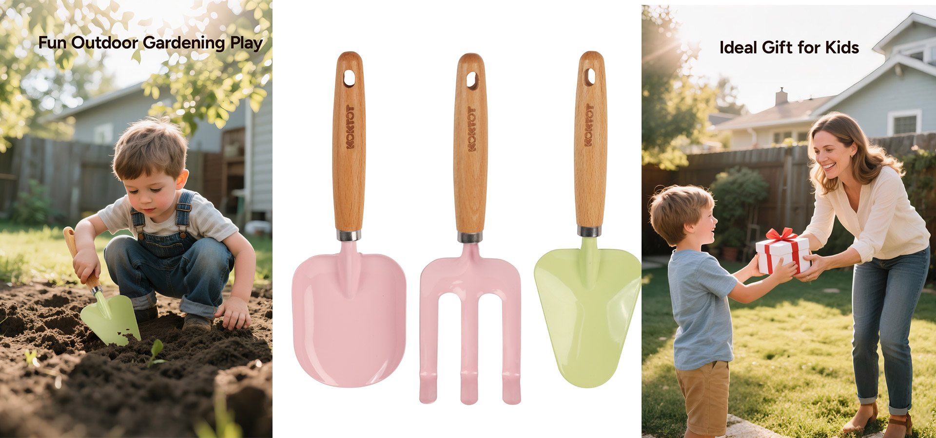 1.Fun Gardening Set: Three child-sized shovels designed for digging, planting, and soil exploration—perfect for little hands to enjoy outdoor gardening adventures. 2.Safe Metal Blades: Rounded, rust-resistant steel edges ensure children can dig and plant safely, giving parents peace of mind..